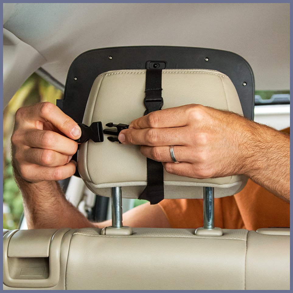 Securely installs in seconds with adjustable straps, ensuring a stable fit on most vehicle headrests.