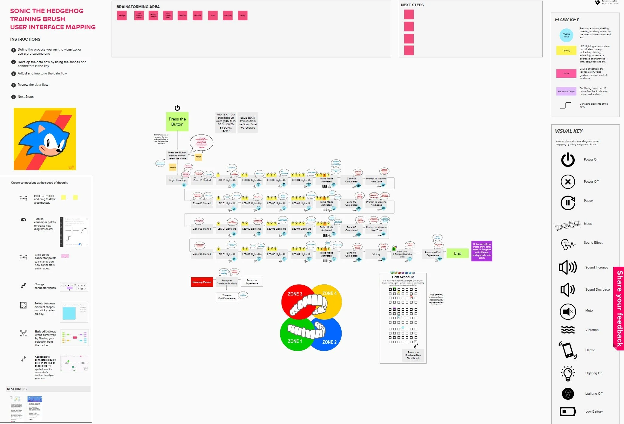 A detailed flowchart or diagram related to Sonic the Hedgehog, featuring instructions, connections, and color-coded zones with text boxes, icons, and schedules.