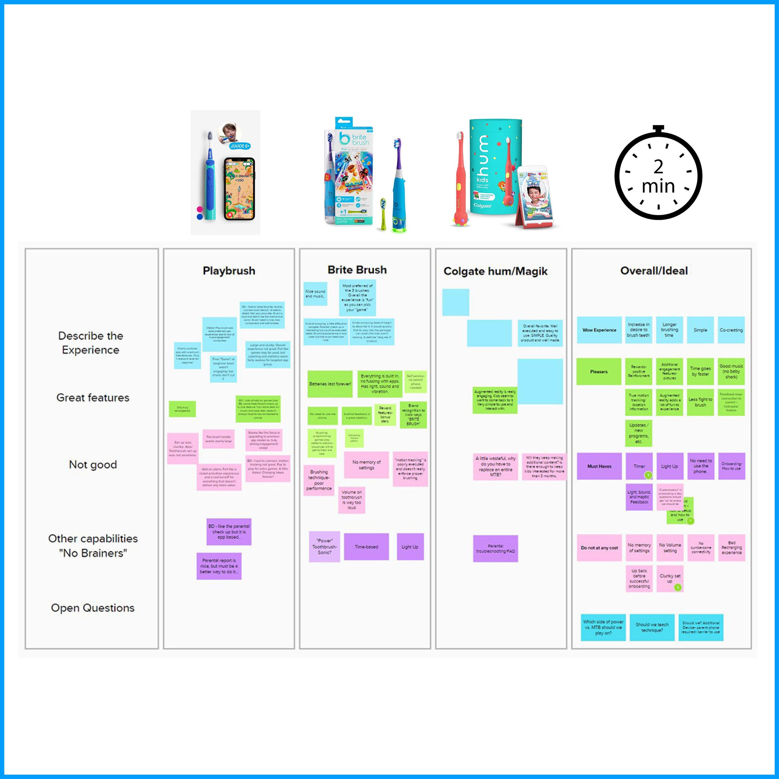 We conducted parent and child interviews, behavioral observations, and market benchmarking to understand existing pain points: short brushing times, lack of engagement, and parental frustration. Through this exploration, we uncovered key insights about play motivation, reward loops, and interaction design that informed the toothbrush concept.