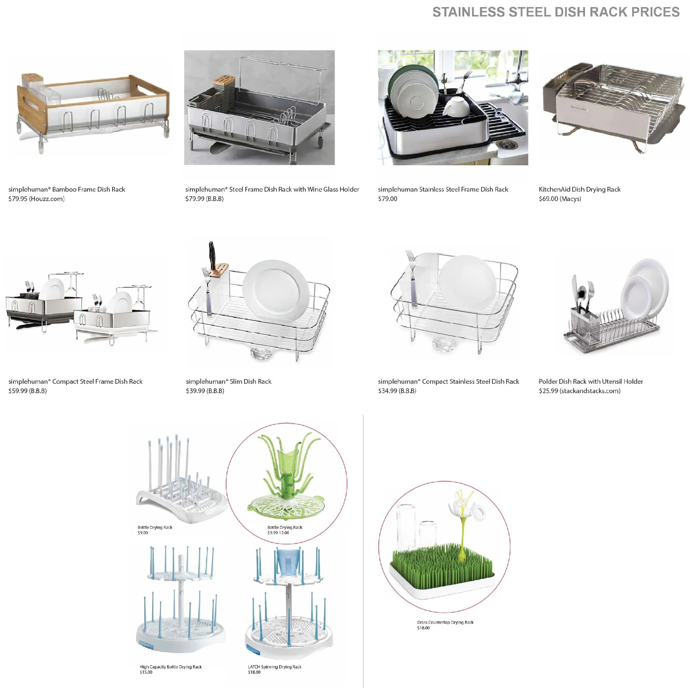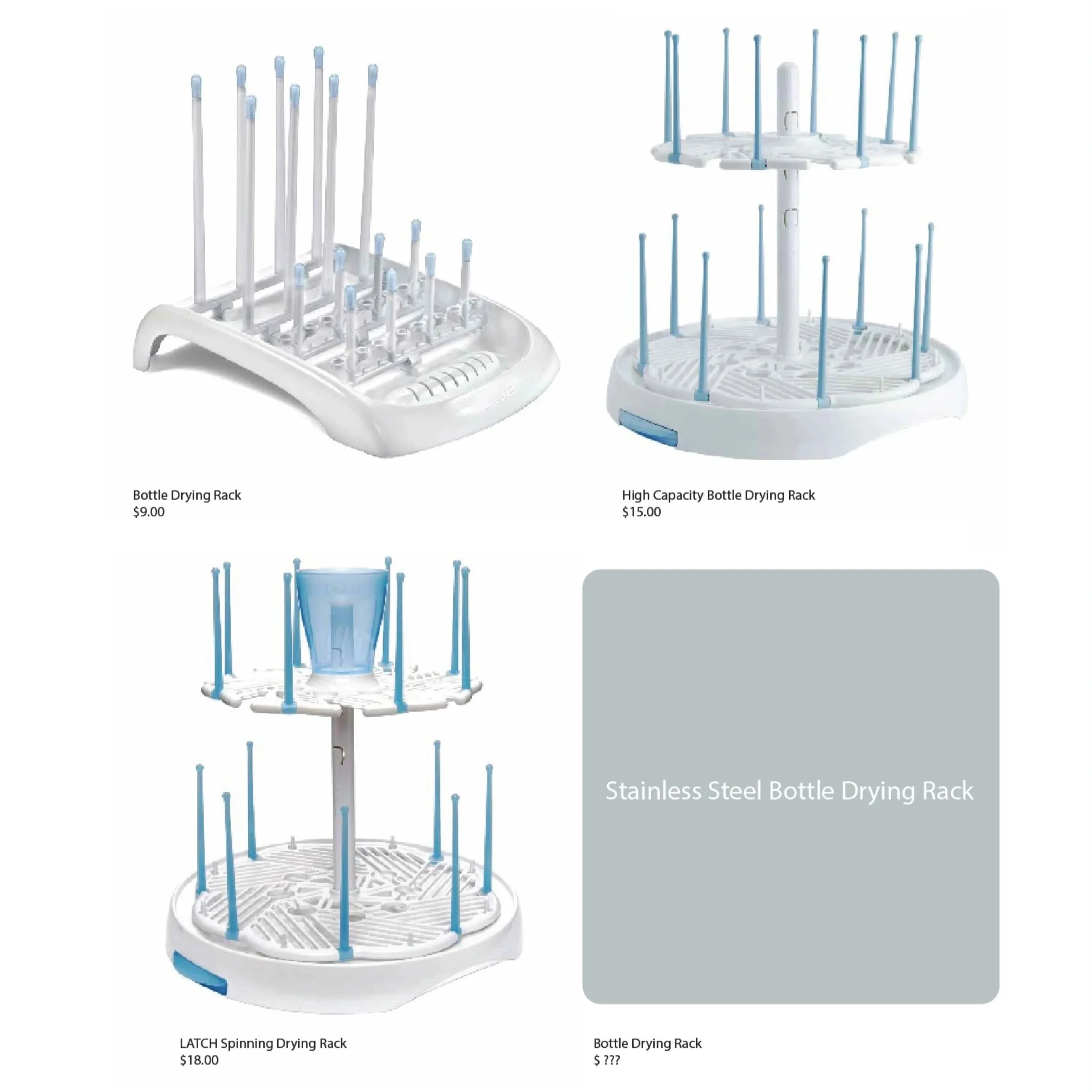 “Premium stainless steel drying rack air dries up to 8 bottles plus contains a large tray area that holds accessories, pump parts and cups.”