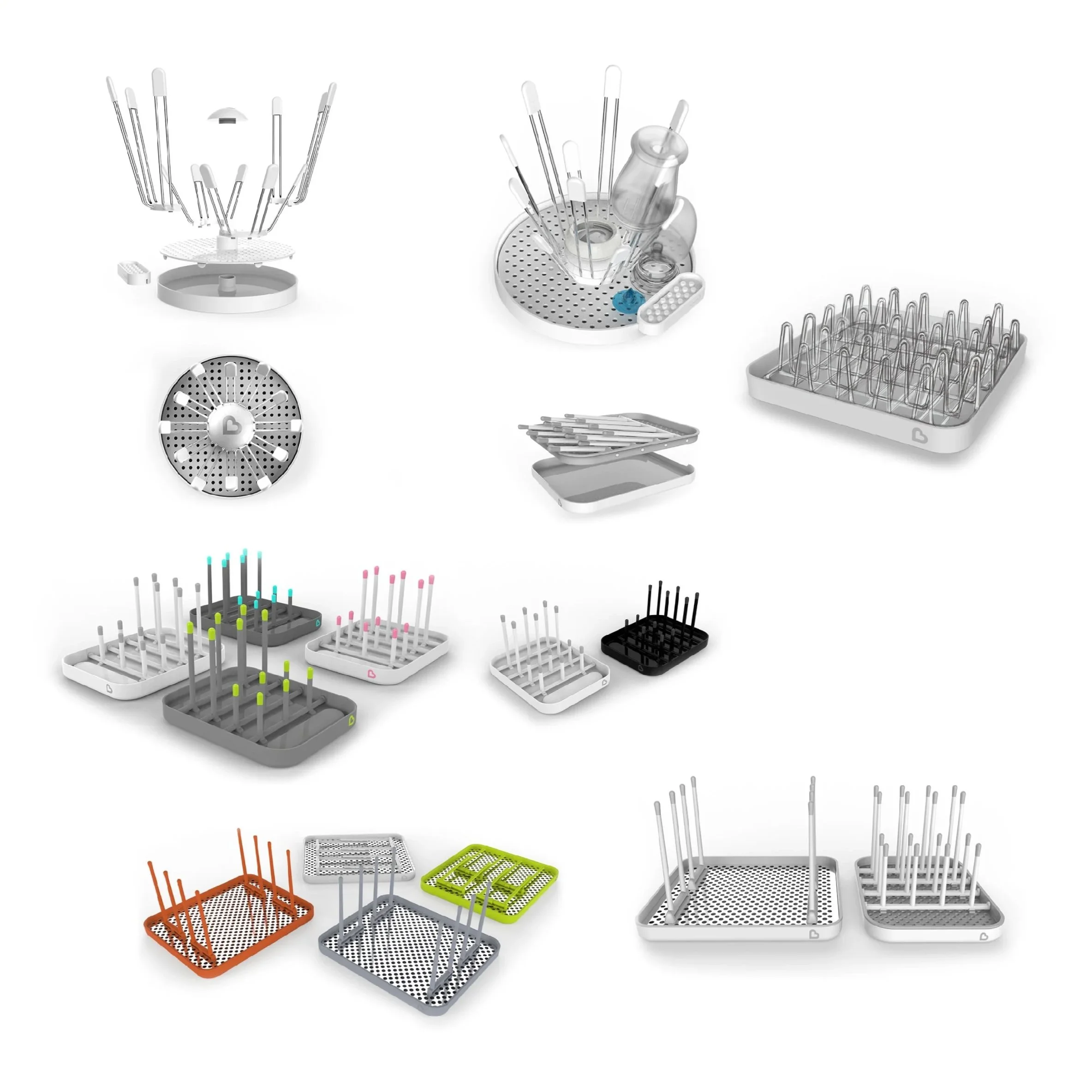 Innovative and sleek design includes moveable drying pegs that can be placed in any configuration to customize the drying rack for your specific drying needs, extending its use beyond the infant and toddler years. Convenient drip tray system collects excess water in the base to keep it away from clean items and off of countertops. Ultra-durable and sturdy drying pegs fold completely flat for easy storage.