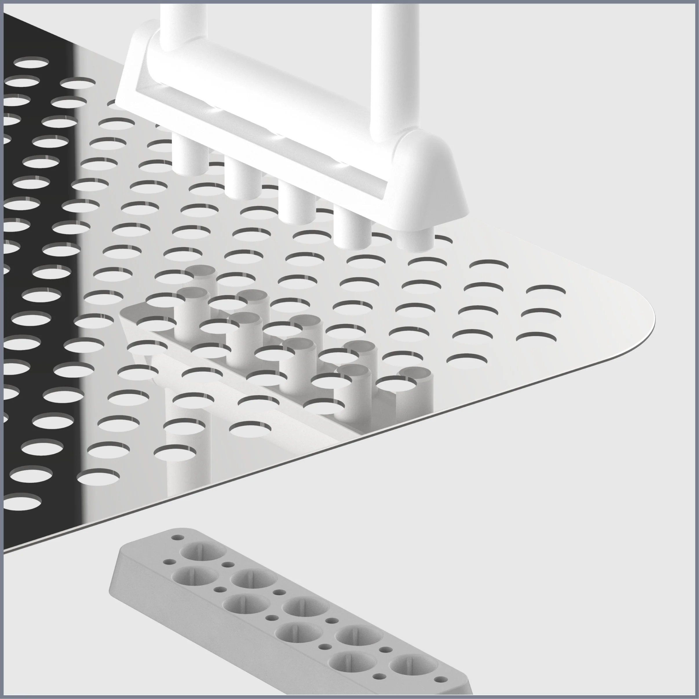 LEGO-like pegs are removable to make rooms for different shapes and sizes of bottles and cups.